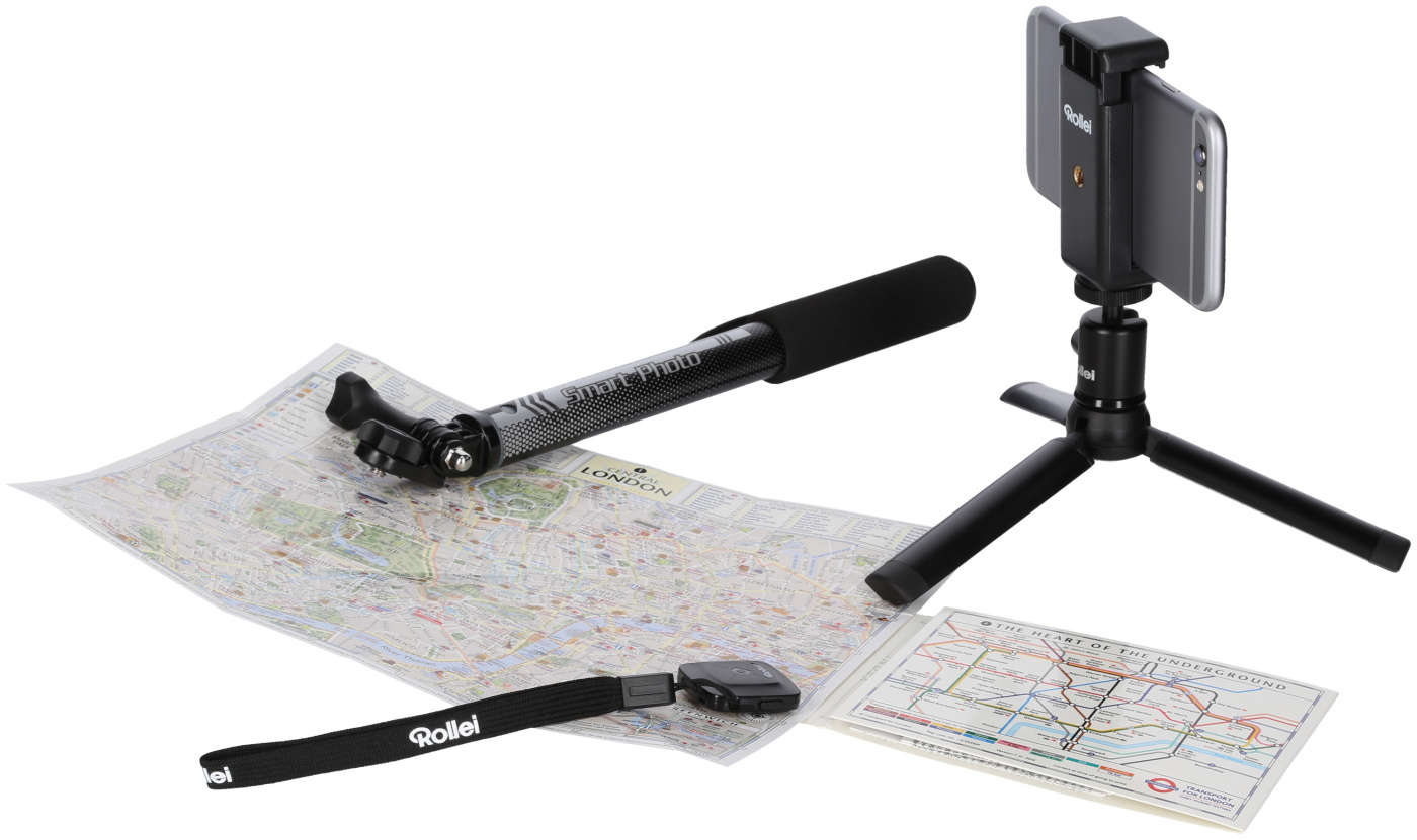 Rollei Smart Photo Selfie Stick poskytuje kompletní potřebné příslušenství pro fotografování mobilním telefonem, které je na cestách potřeba. Celý set se skládá ze selfie tyče, stativu, držáku na smartphone a dálkové spouště. Selfie tyčka je tvořena ze 4 hliníkových segmentů, které při maximální vysunutí dosahu celkové délky 87cm a minimální délka je pak 27,5cm. Selfie tyč je vybavena ¼“ šroubem pro uchycení držáku pro smartphone a v rukojeti se pak nachází ¼“ závit pro upevnění selfie tyče na stativ. Tato kombinace umožňuje praktické prodloužení cestovního stativu, který jinak nabízí maximální výšku 9cm.